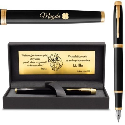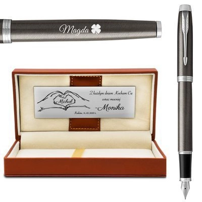 Każde piórko Parker IM umożliwia nadto umieszczenie na nim oryginalnego graweru. Może on przybrać dowolną postać – imienia, życzeń, podziękowań, charakterystycznej daty, a nawet wyrazów sympatii i miłości. Grawer jest przy tym bardzo trwały. Ponadto piórko Parker IM z grawerem oferujemy w oryginalnym, prezentowym opakowaniu, które również może zawierać specjalną, wygrawerowaną dedykację. Nasze pióro Parker IM z grawerem zostało zaprojektowane z dbałością o każdy, najdrobniejszy szczegół. Oferuje ponadczasowy design i oryginalną kolorystykę. Ten gadżet doskonale sprawdzi się jako prezent dla kogoś bliskiego, znajomego z pracy, szefa lub nauczyciela. Najczęściej nasi klienci wybierają pióro Parker IM z grawerem na wszelkie absolutoria, odejście kolegi lub pracownika z pracy, podziękowanie za współpracę. Przyda się na maturę, a także z okazji ukończenia liceum, technikum lub szkoły wyższej. Na pewno każdy świeżo upieczony licencjat lub magister ucieszy się z takiego drobiazgu.