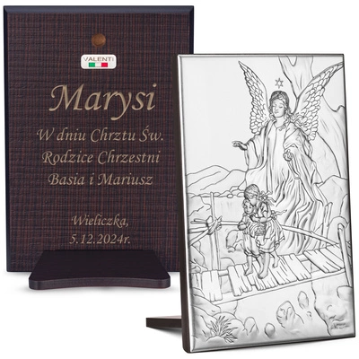 OBRAZEK Srebrny VALENTI Anioł Stróż 12x12 Prezent na Chrzest Grawer GRATIS