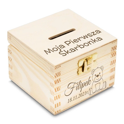 Drewniana skarbonka z grawerem dla dziecka na Chrzest Roczek Urodzinki