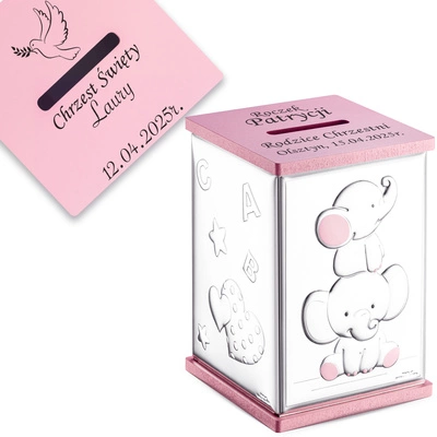 Skarbonka Srebrna SŁONIK VALENTI Prezent na Chrzest Roczek Grawer GRATIS S1